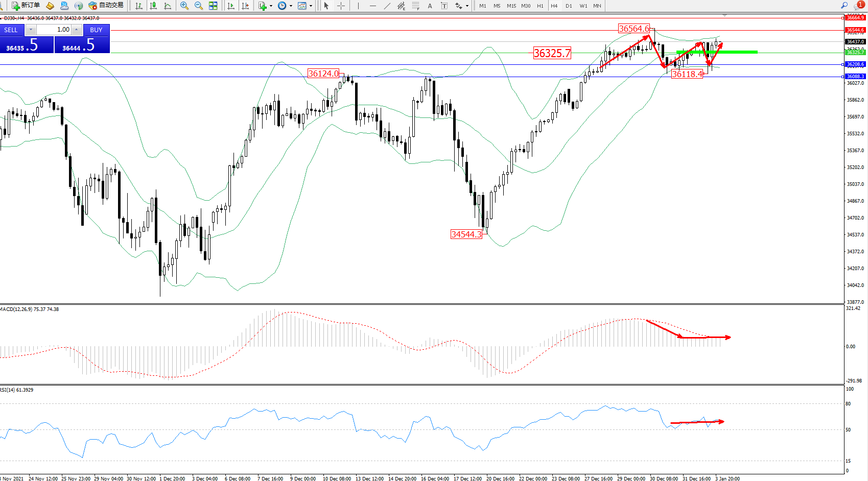 交易策略:36325上方看涨,目标36544、36664