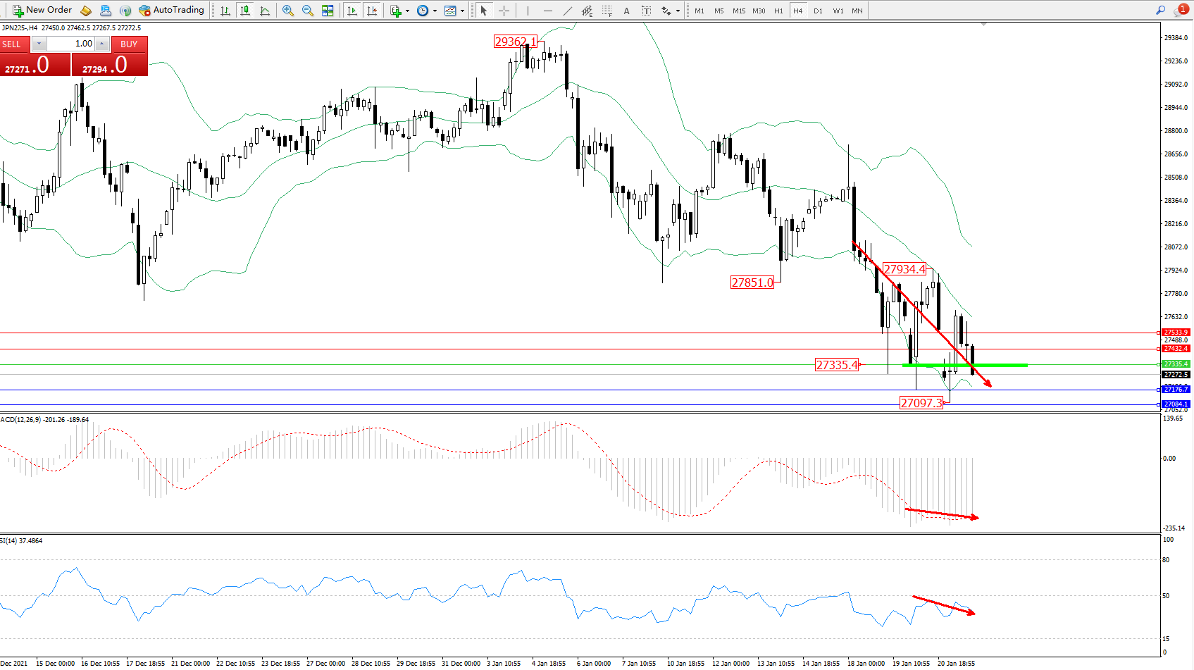 日经指数JPN225——4小时K线图显示: