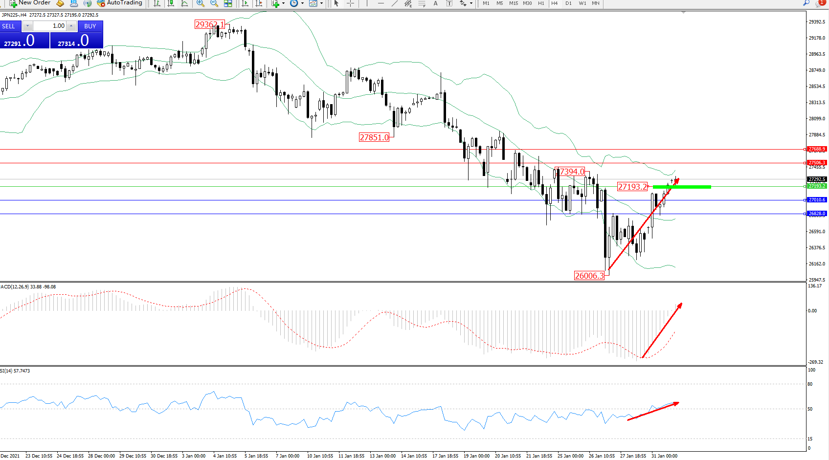 日经指数JPN225——4小时K线图显示: