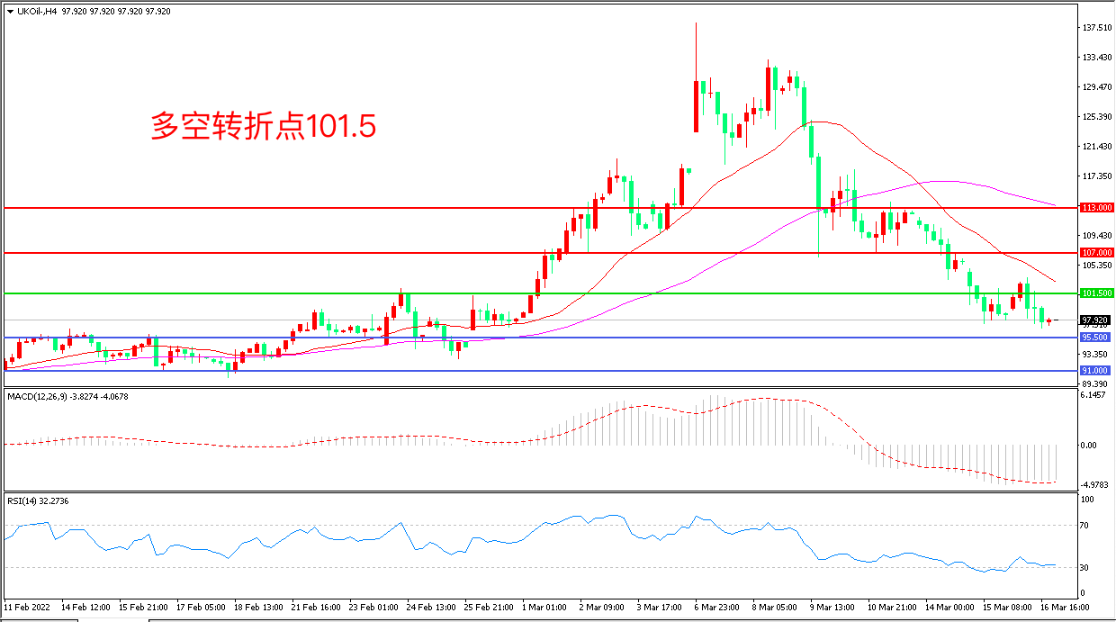 周三(3月16日),有消息称俄乌双方已经准备好一份在乌克兰保持中立、裁军的前提下实施的停火撤军计划,布伦特原油闻声下挫,收报97.92美元/桶。晚间,美国能源信息署公布的EIA数据显示,美国当周原油库存意外超预期,需求下降仍然给油价短线下行压力,谨防油价出现大幅回落。