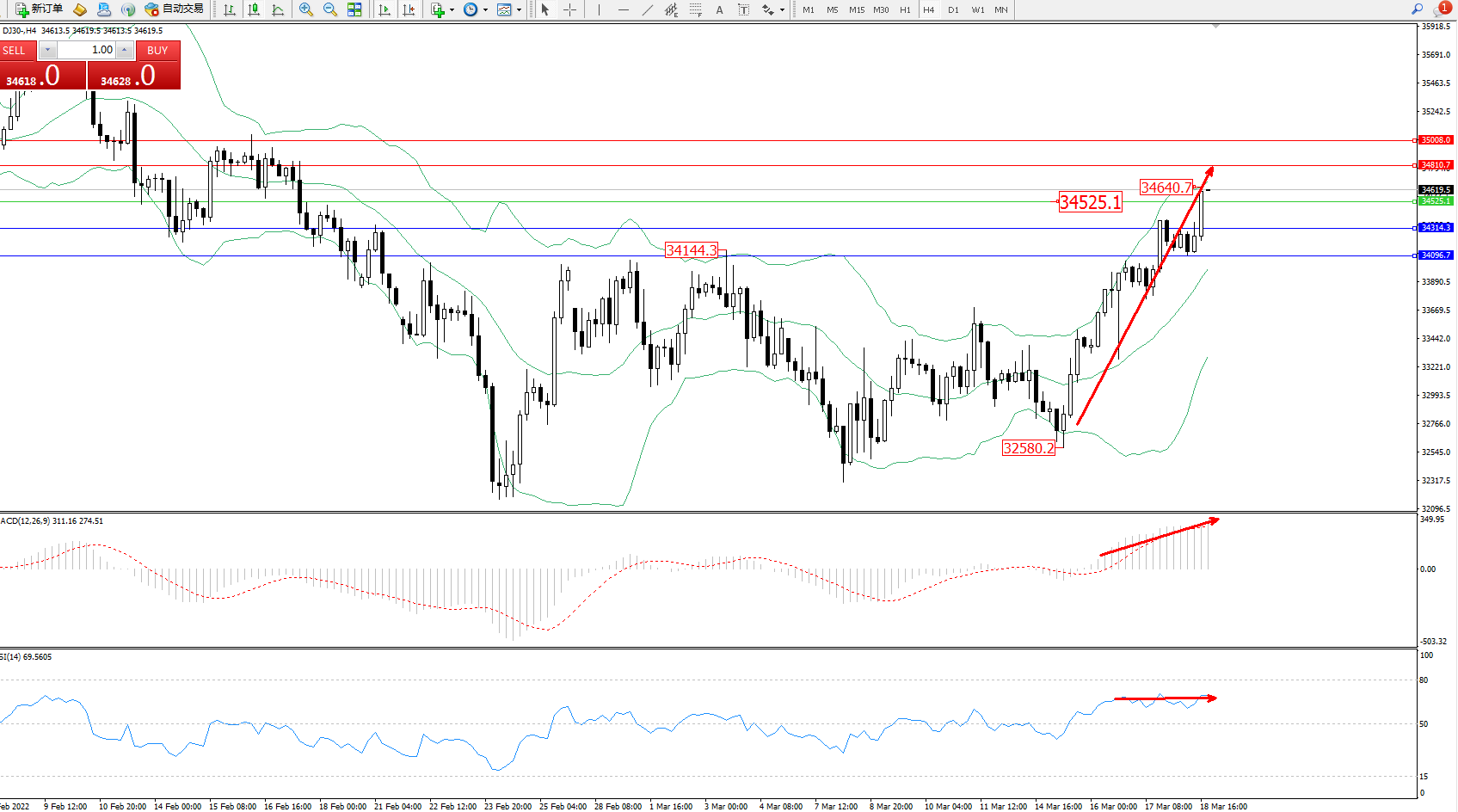 技术点评:多头动力延续布林带指标通道中上轨区间持续震荡上扬,高位抵达34640附近整理,短期多头动力有进一步拉升态势,布林带指标呈张口走势后开始收口拉升中,MACD指标处于多头区域维持整理缓慢上移,RSI指标处于多头区域维持整理徘徊中;