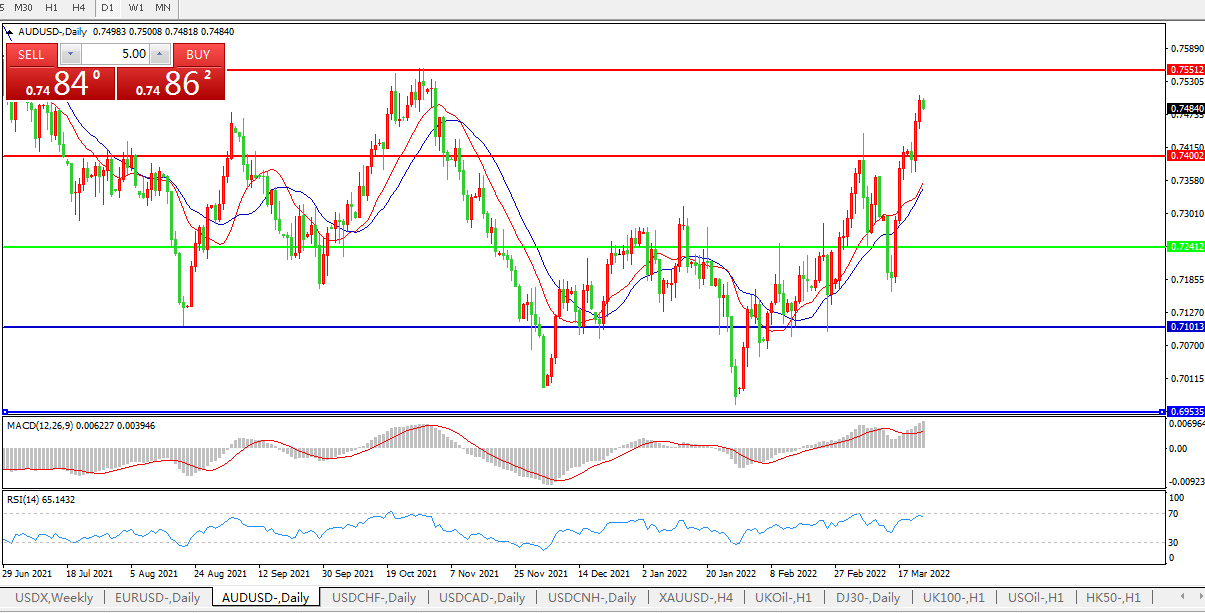 澳元兑美元AUD/USD受惠于美国股市,在过去六个交易日中有五个交易日大幅上涨。西太平洋银行货币策略师Sean Callow表示,市场可能已经看到投机者回补空头仓位,但乌克兰冲突仍在继续,令澳大利亚大部分关键商品出口的价格承压下降。技术上讲,在触及2021年10月的高点0.7556之前,该货币对目前没有遇到重大障碍。但Callow补充称,考虑到能源价格飙升对全球经济增长造成的损害,最近的反弹可能无法持续。