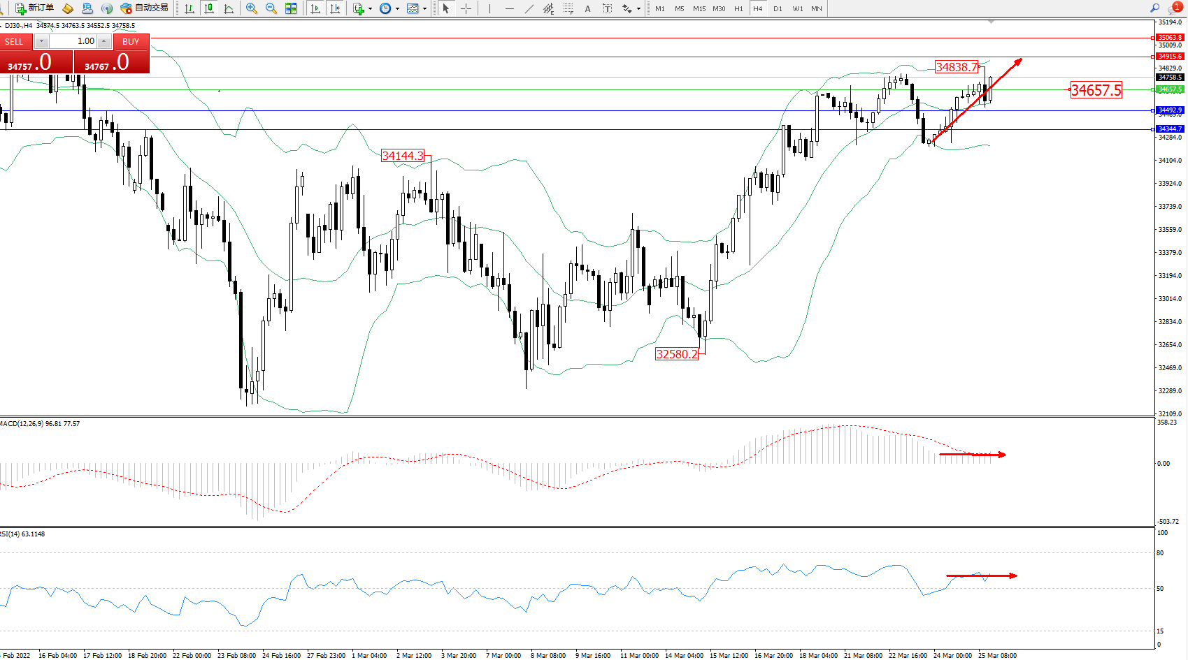 技术点评:多头动力维持高位布林带指标通道内震荡平移,期间纠结于上下轨区间节点整理,多头动力有继续向上移动迹象,MACD指标处于0轴线上方弱势徘徊,RSI指标处于50均衡线上側弱势整理中;