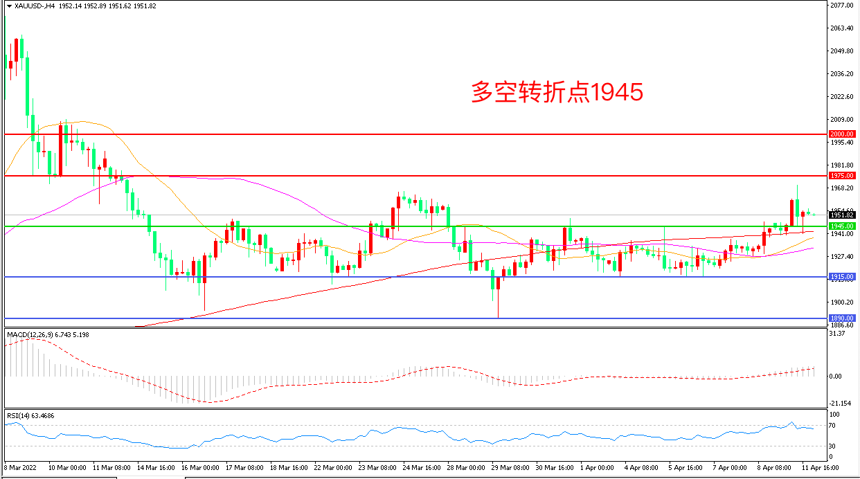 周一(4月11日),乌克兰和俄罗斯近期均向乌克兰东部地区投入了增援部队,双方可能引发最大军事冲突,市场避险情绪陡增,金价强势上行,收报1952.71美元/盎司。近期黄金在权衡加息和地缘冲突的影响中反复震荡,本次突破打破了前期整理区间,如能再度上行,有望开启新一轮涨势。