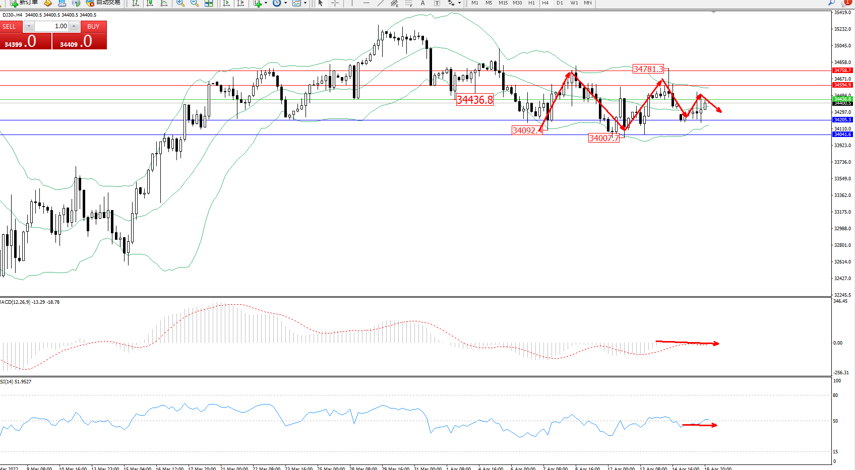 道琼斯指数DJ30——4小时K线图显示: