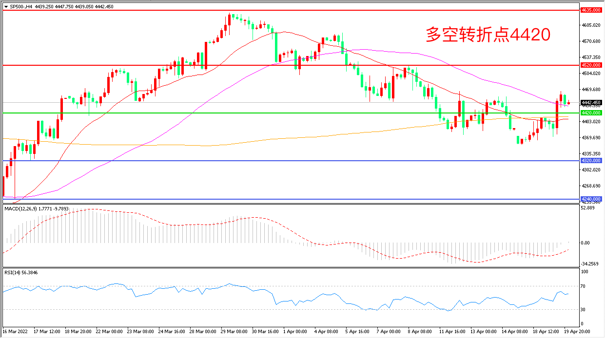 周二(4月19日),圣路易斯联储主席布拉德表示不排除加息多达75个基点之后,投资者重新评估收紧预期,标普500自低位大幅拉升,收报4444.75点。随着对经济衰退的担忧占据上风,投资者正在迅速撤出股票,但风险资产的集体强势将为美股提供一定支撑,多空拉锯之下,标普500宽幅震荡概率较大。