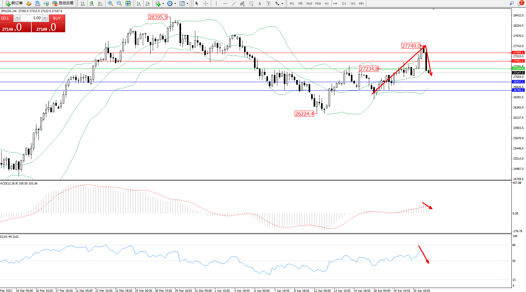日经指数JPN225——4小时K线图显示: