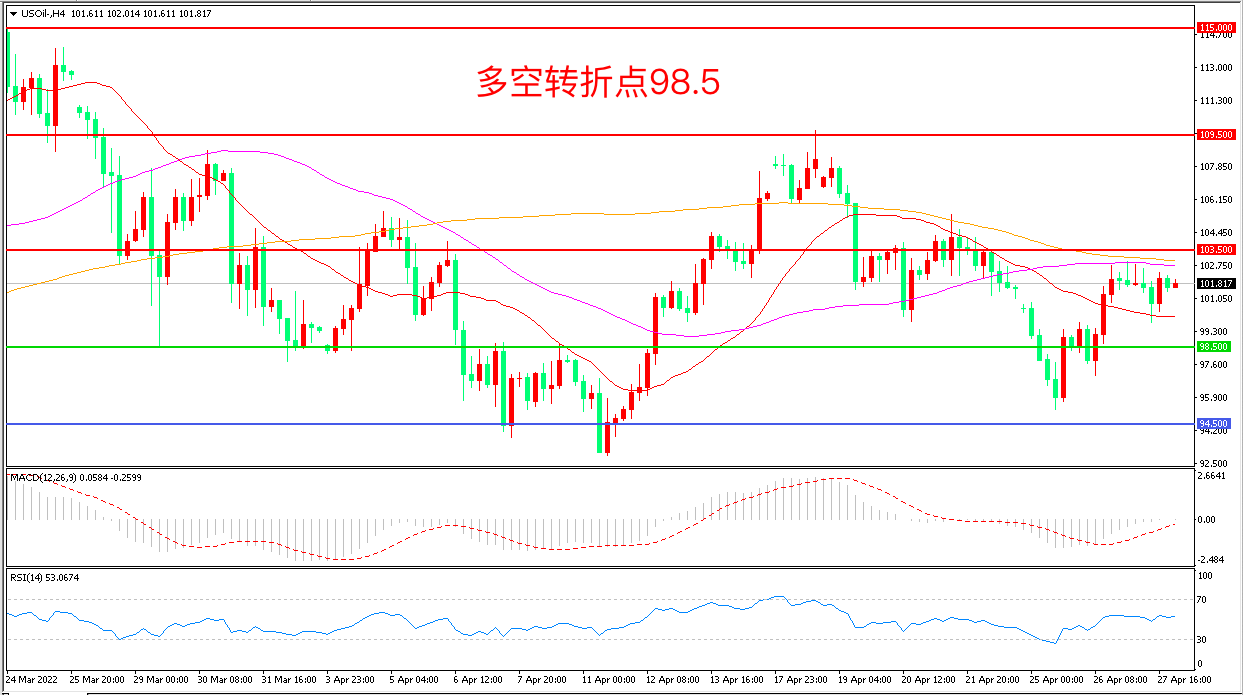 周三(4月27日),西方与俄罗斯的对峙在能源“战场”扩大化,最新消息称德国准备支持欧盟制裁俄罗斯石油,美国WTI原油延续窄幅震荡,收报101.86美元/桶。油价日线十字星收盘这意味着多空相持阶段进一步延续,高位区间内的当下油价缺乏能推动单边运行的能量,油价继续横盘概率较大。