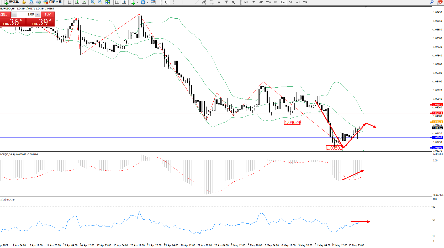 备选策略:1.04624上方看涨,目标1.05014、1.05381