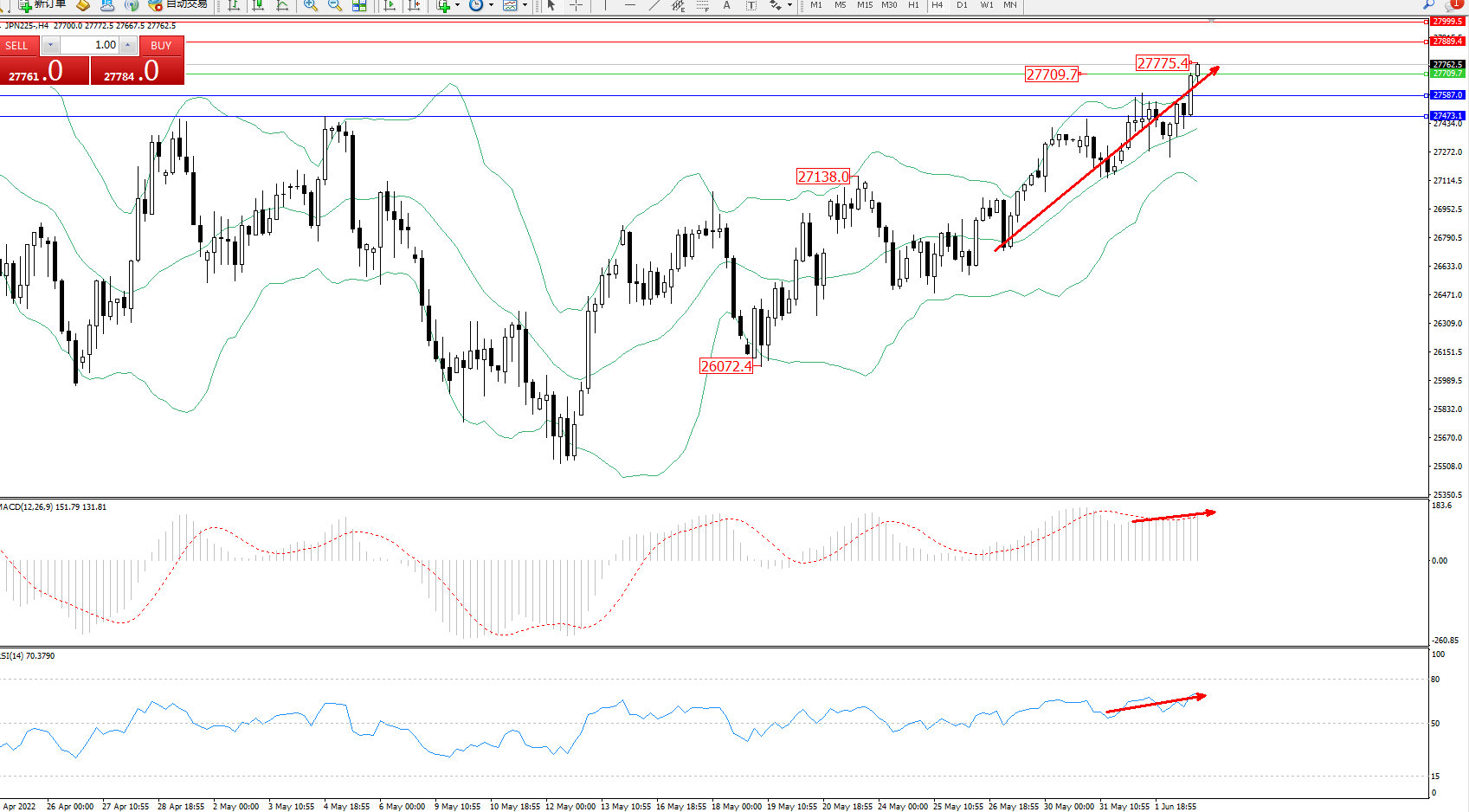 日经指数JPN225——4小时K线图显示: