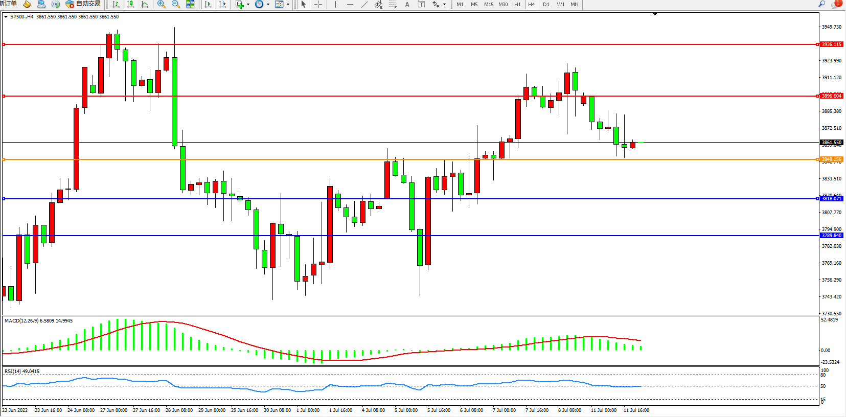 标普SP500——4小时K线图显示: