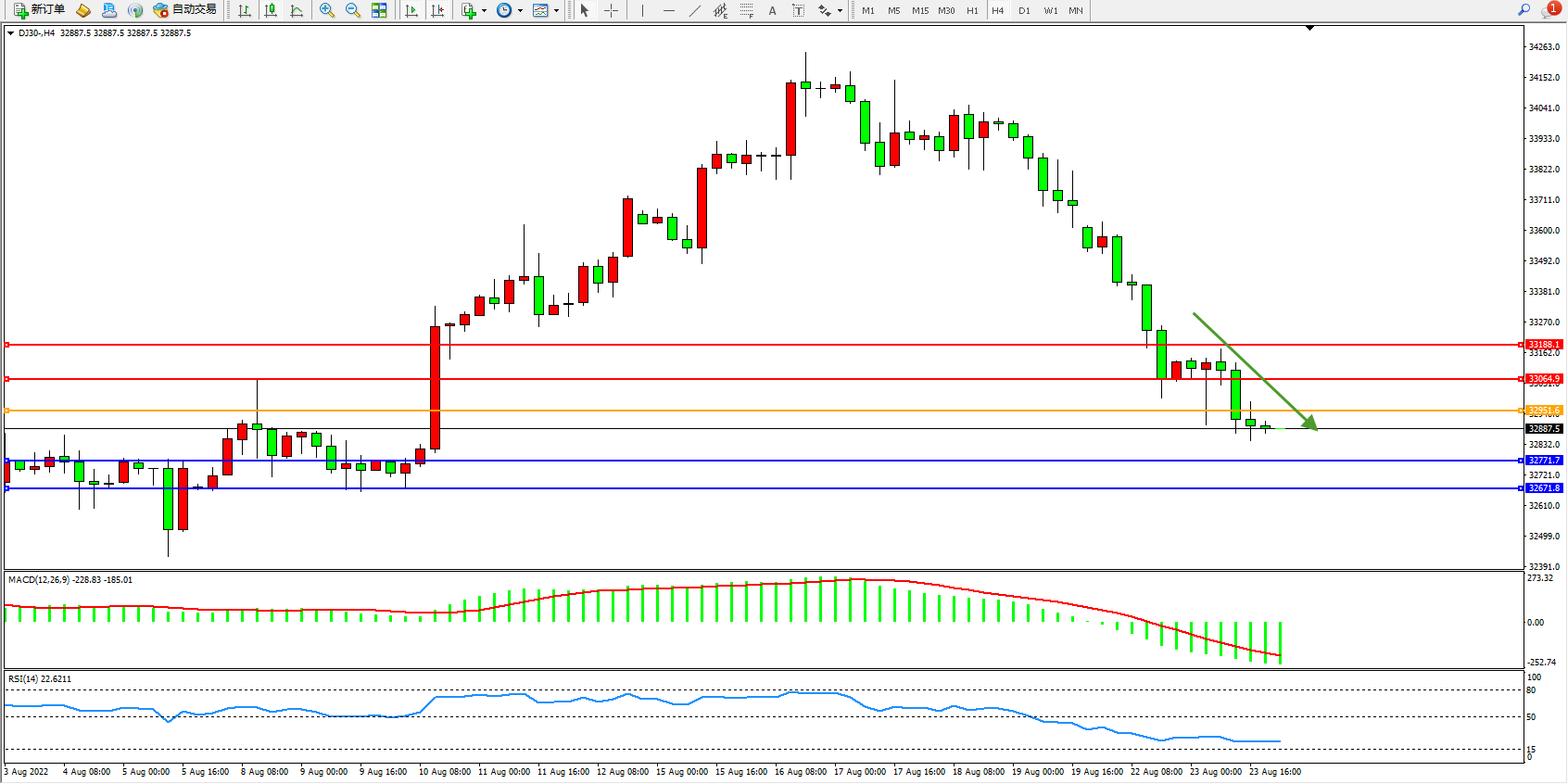 道琼斯指数DJ30——4小时K线图显示: