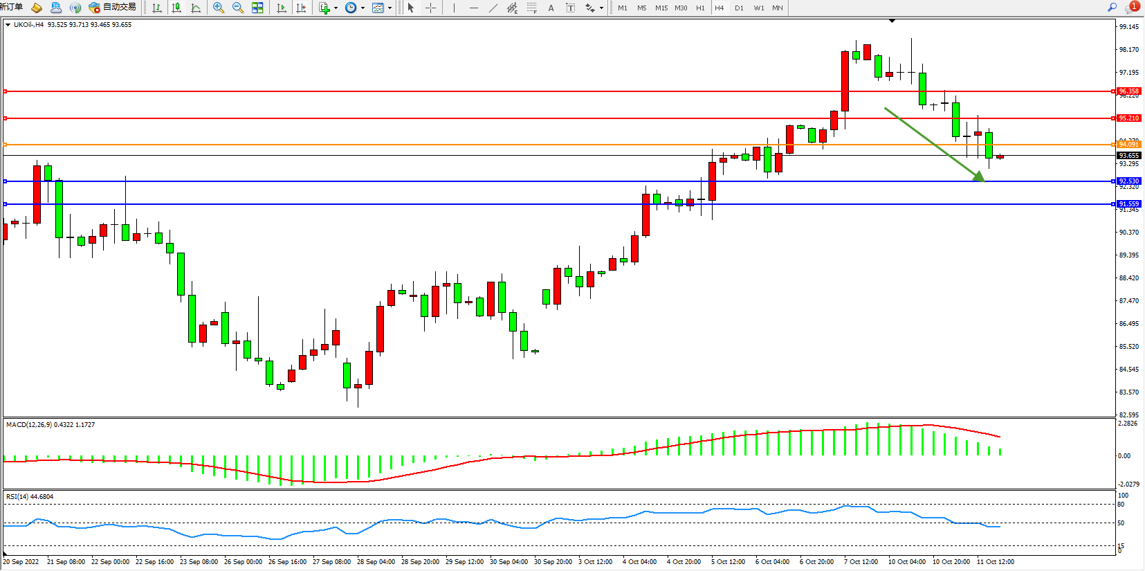 布油维持93.655附近震荡,受全球经济衰退的担忧打压,同时全球央行加息也给油价压力。不过,地缘局势紧张和OPEC+减产,始终给油价支持。