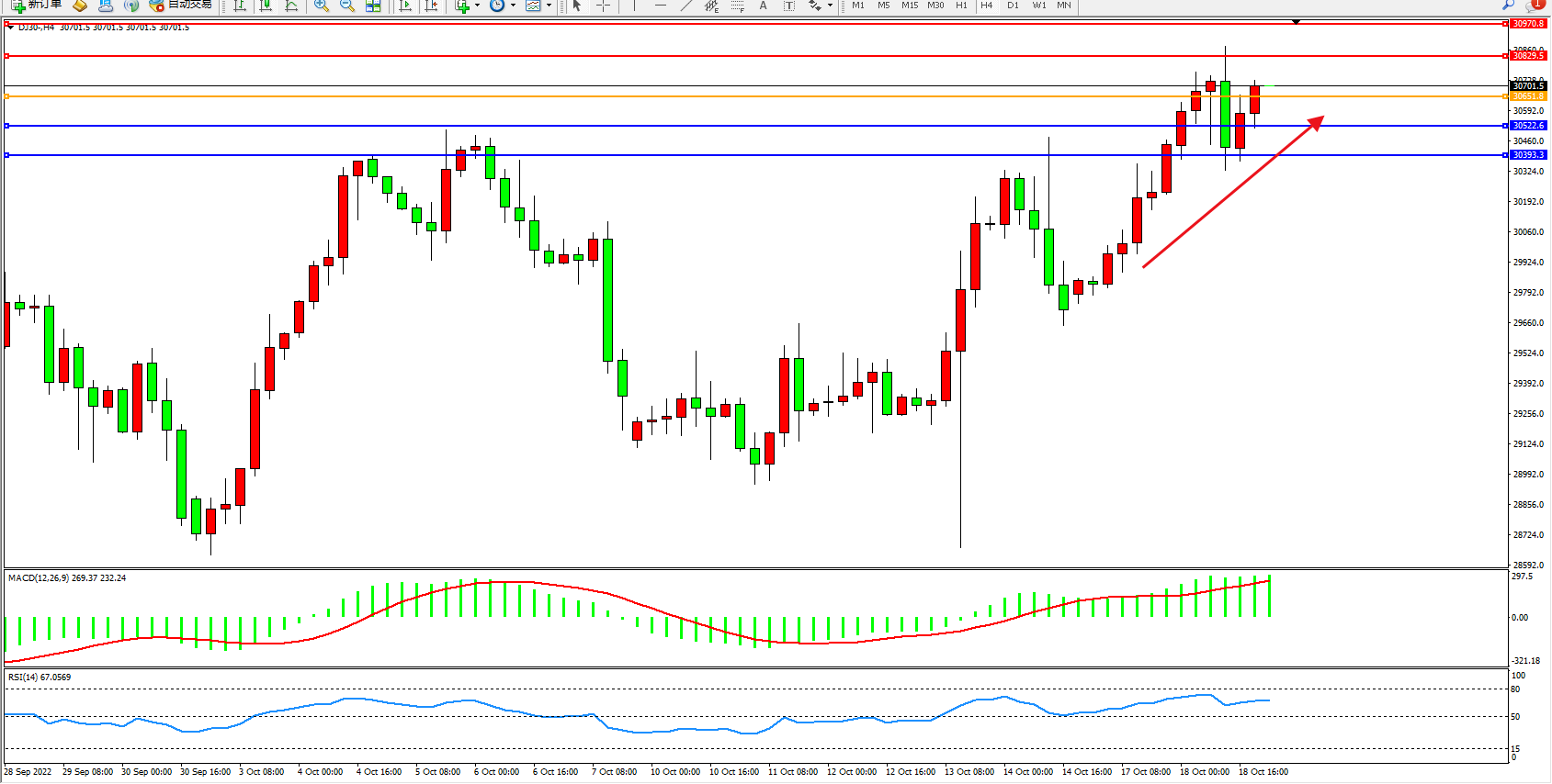 道琼斯指数DJ30——4小时K线图显示: