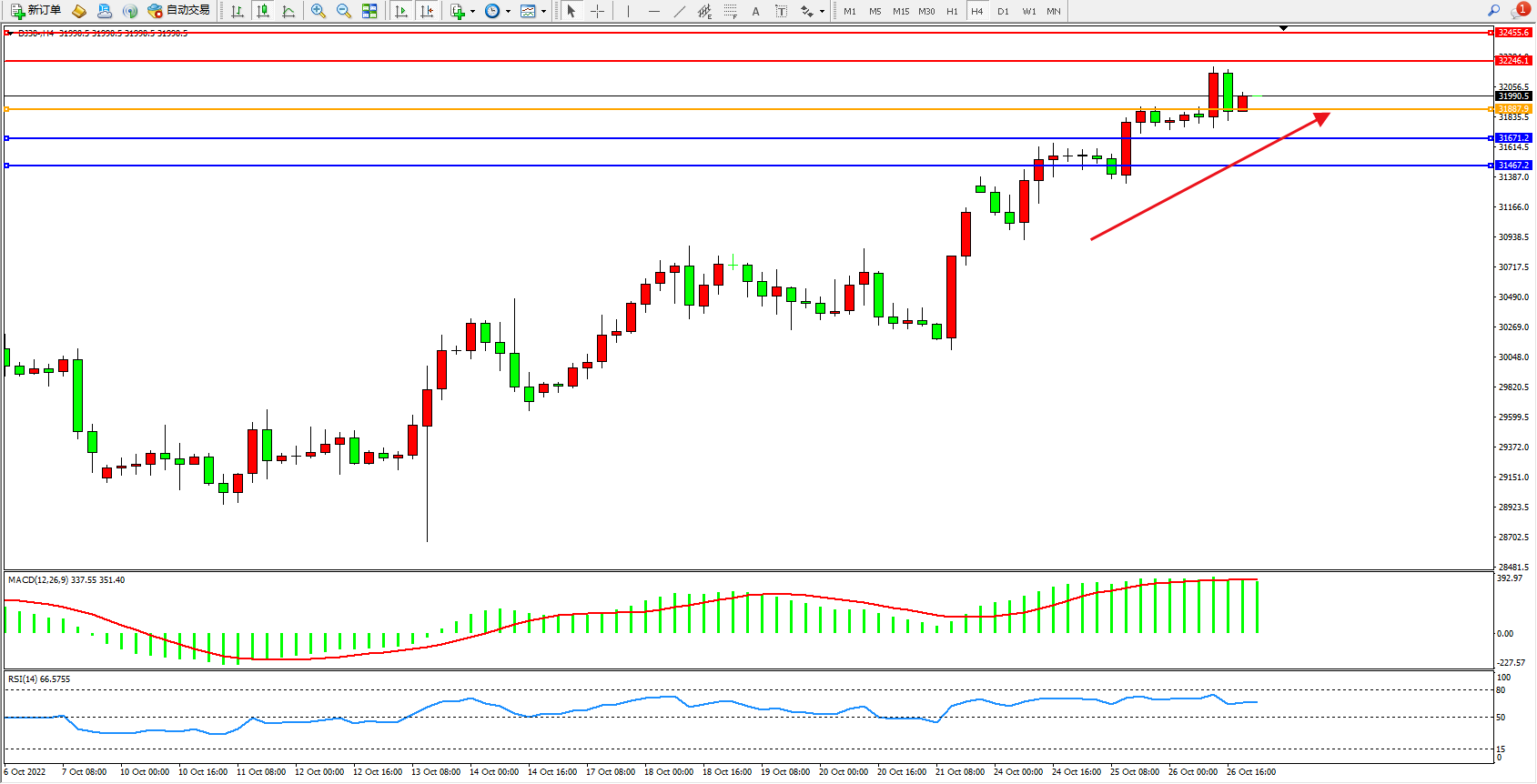 道琼斯指数DJ30——4小时K线图显示: