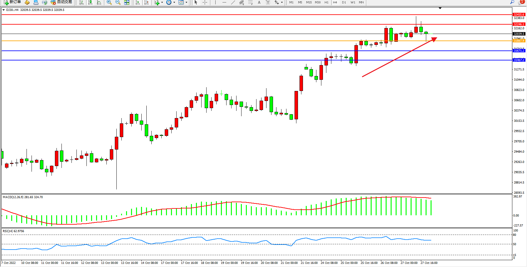 道琼斯指数DJ30——4小时K线图显示: