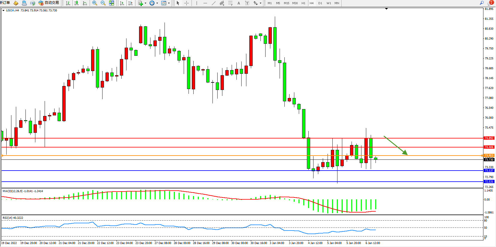 交易策略:73.953下方看跌,目标73.137、72.531
