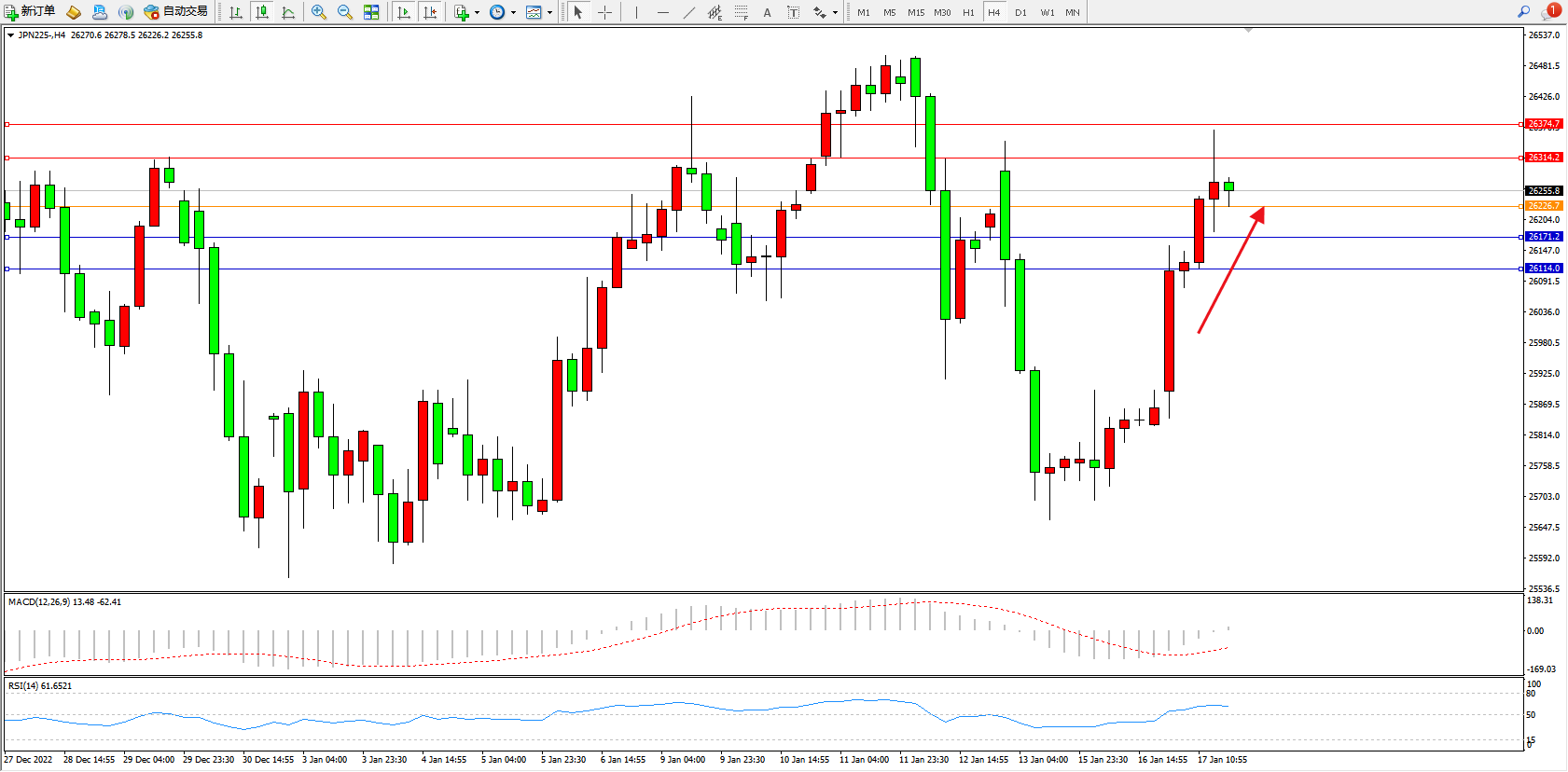 日经指数JPN225——4小时K线图显示: