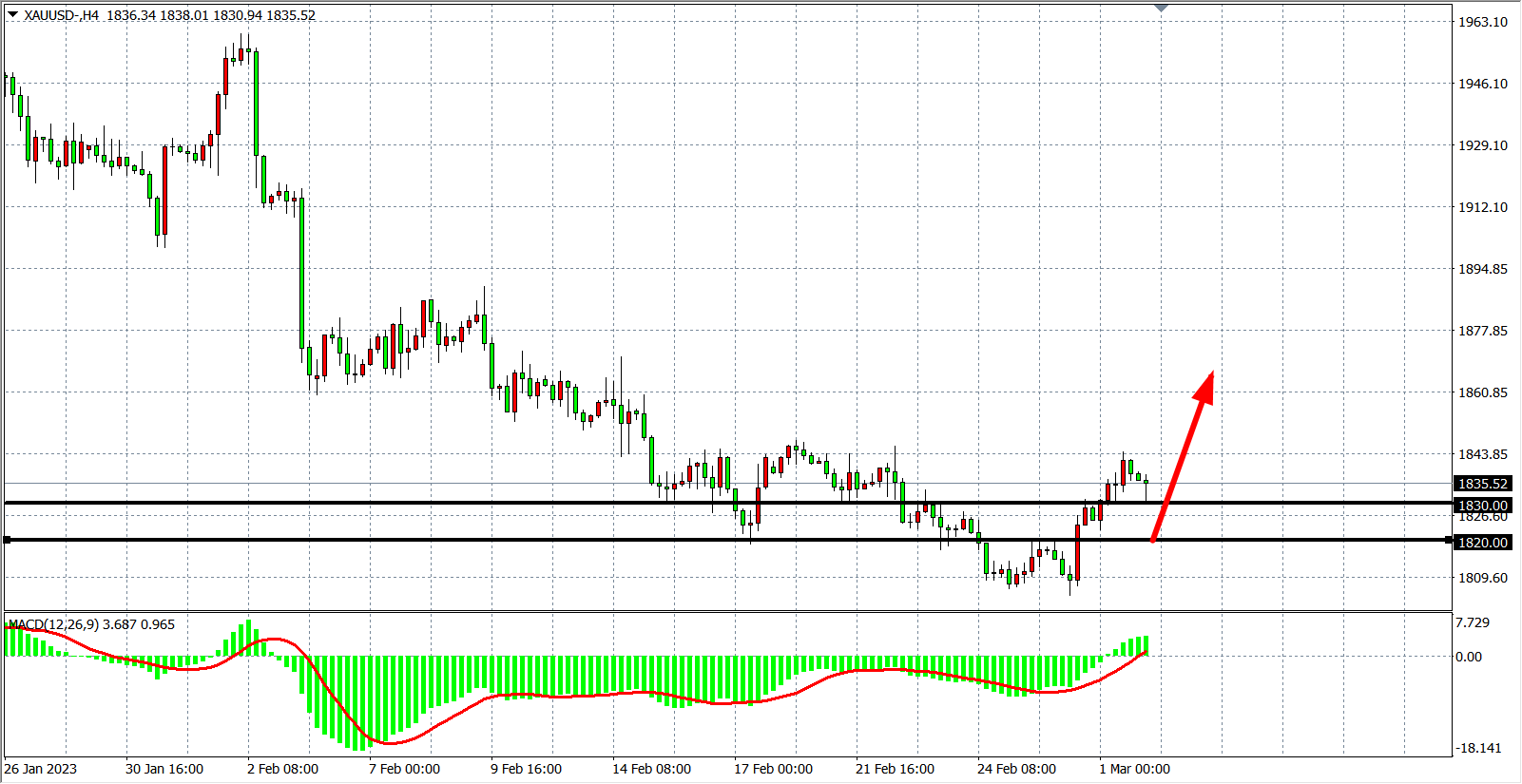 4小时图看,金价在上破1820后持续走强,MACD在零轴之上呈放量状态,形态延续底部反弹,当前1820的强阻力已转化为支撑,同时新支撑上移至1830,日内在1820之上继续看涨,上看1840-1860附近,若跌破1820则下看1805-1790附近。