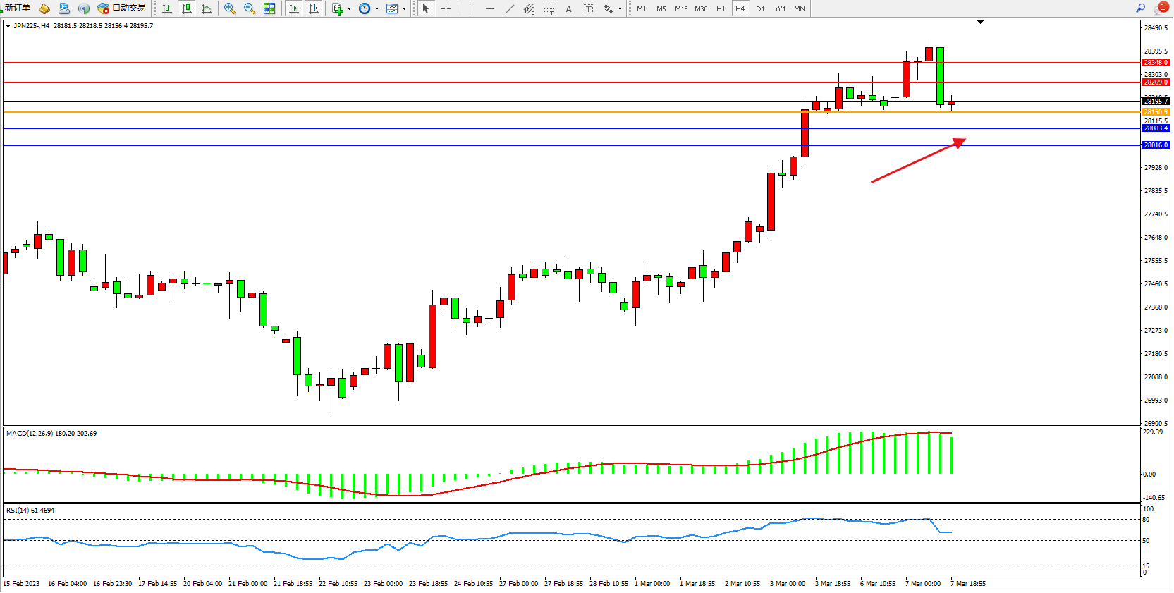 4小时图看:高位多头动力持续震荡上扬,短期出现回撤,市场看涨情绪依旧,MACD指标处于多头区域高位整理,RSI指标处于多头区域整理;