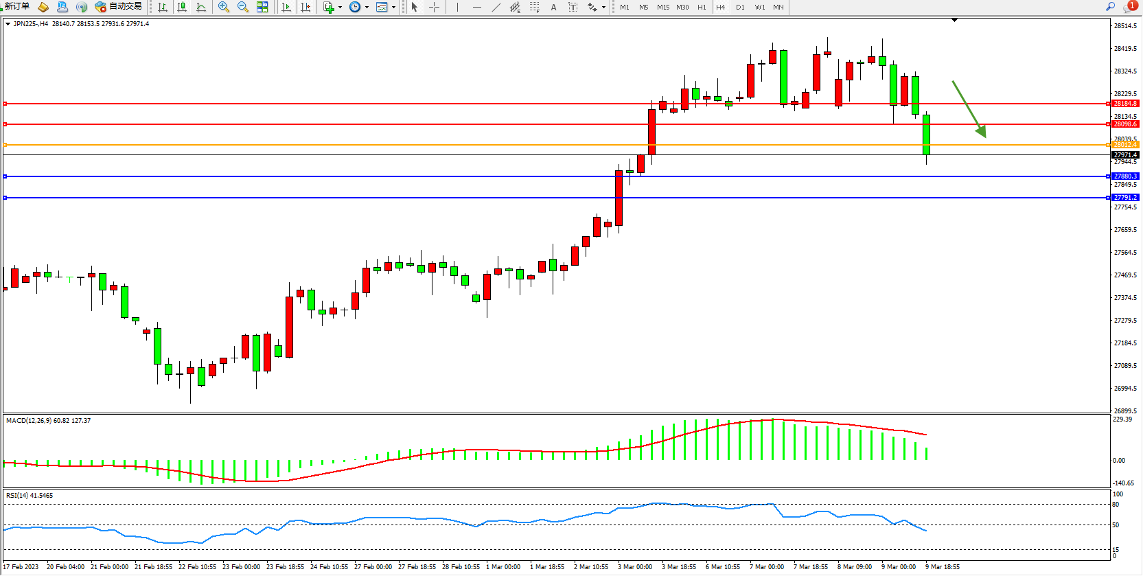 日经指数JPN225——4小时K线图显示: