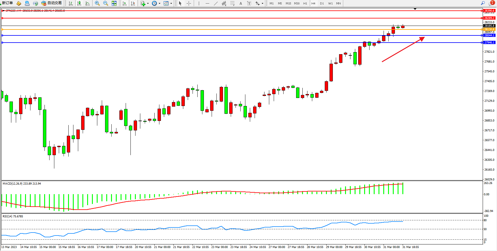 日经指数JPN225——4小时K线图显示: