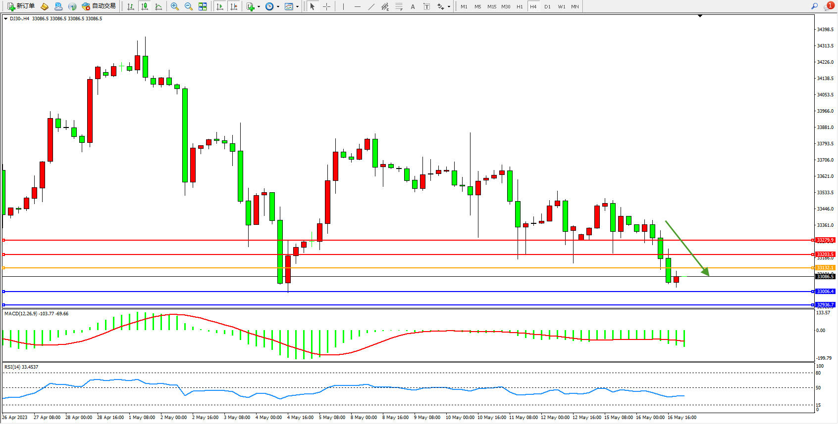 道琼斯指数DJ30——4小时K线图显示: