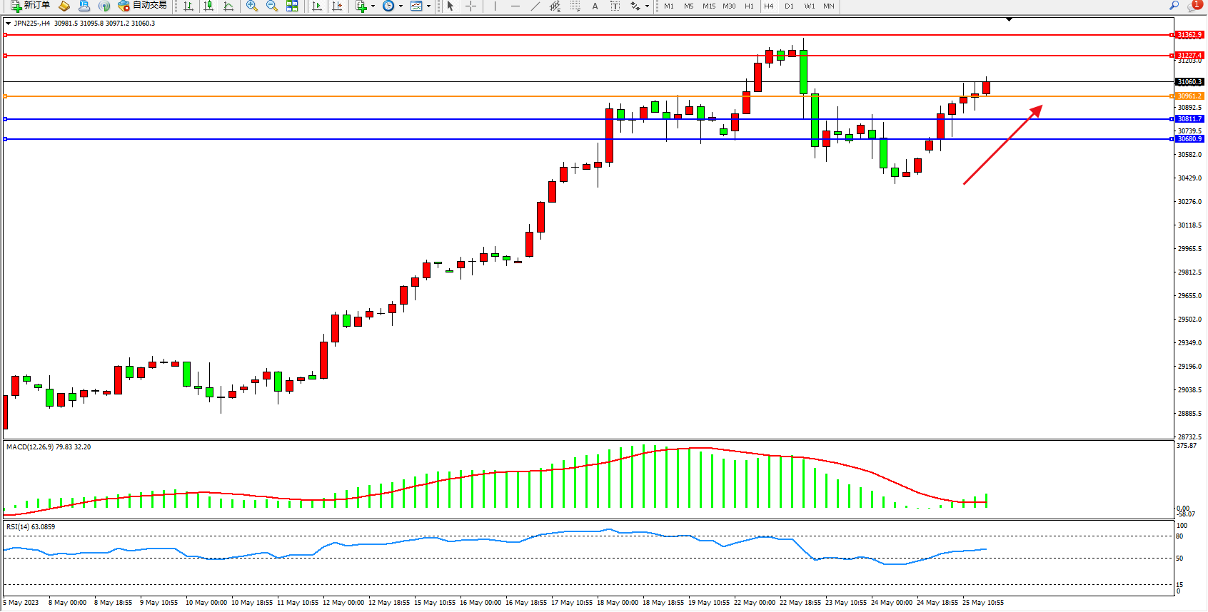 日经指数JPN225——4小时K线图显示: