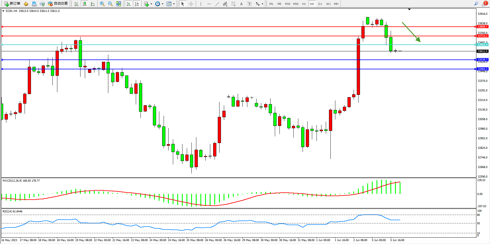 道琼斯指数DJ30——4小时K线图显示: