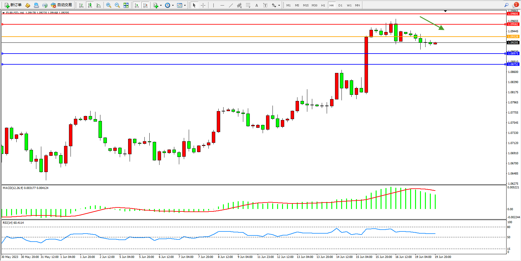欧元美元EURUSD—4小时K线图显示: