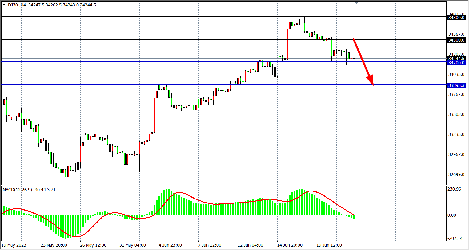 4小时图看,道指延续回落至34200附近,MACD量能在下穿零轴,行情回调延续,下方支撑34200-33900,上方阻力34600-34800。