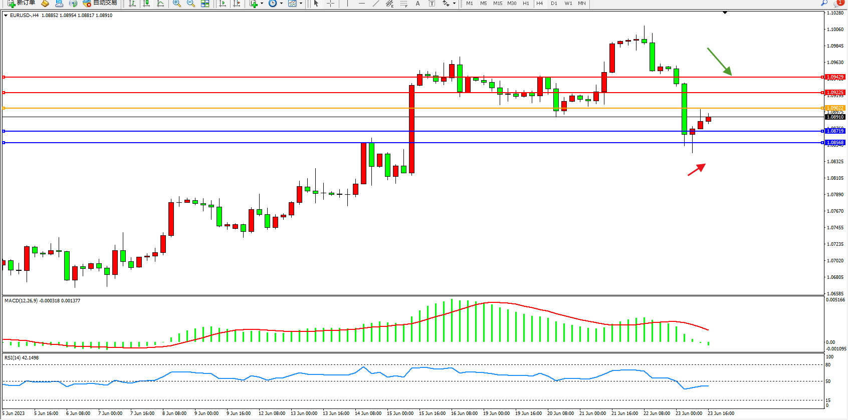 欧元美元EURUSD—4小时K线图显示:
