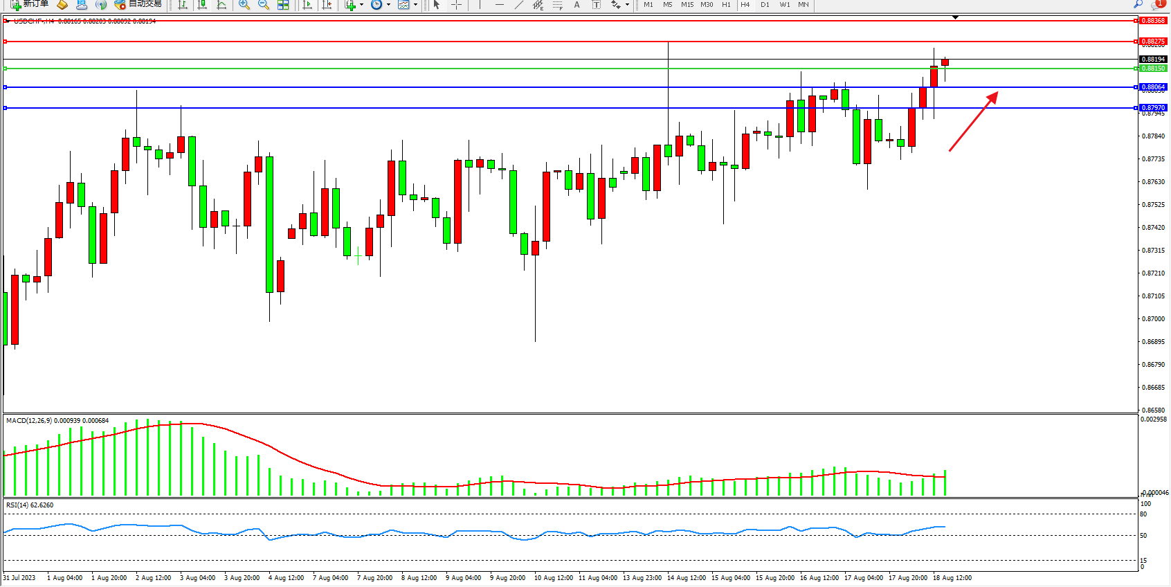 美元瑞郎USDCHF——4小时K线图显示: