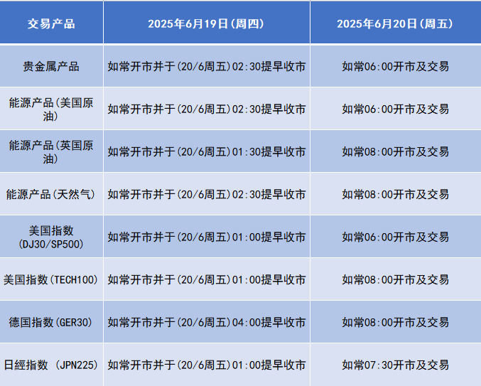 因应2025年6月19日(周四)为美国假期,本公司以下产品的交易时间将于假期期间作以下安排,敬请留意。