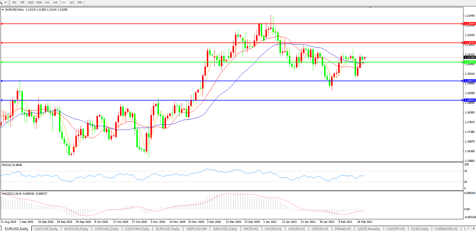 交易策略:1.2100上方看涨,目标1.2200、1.2300