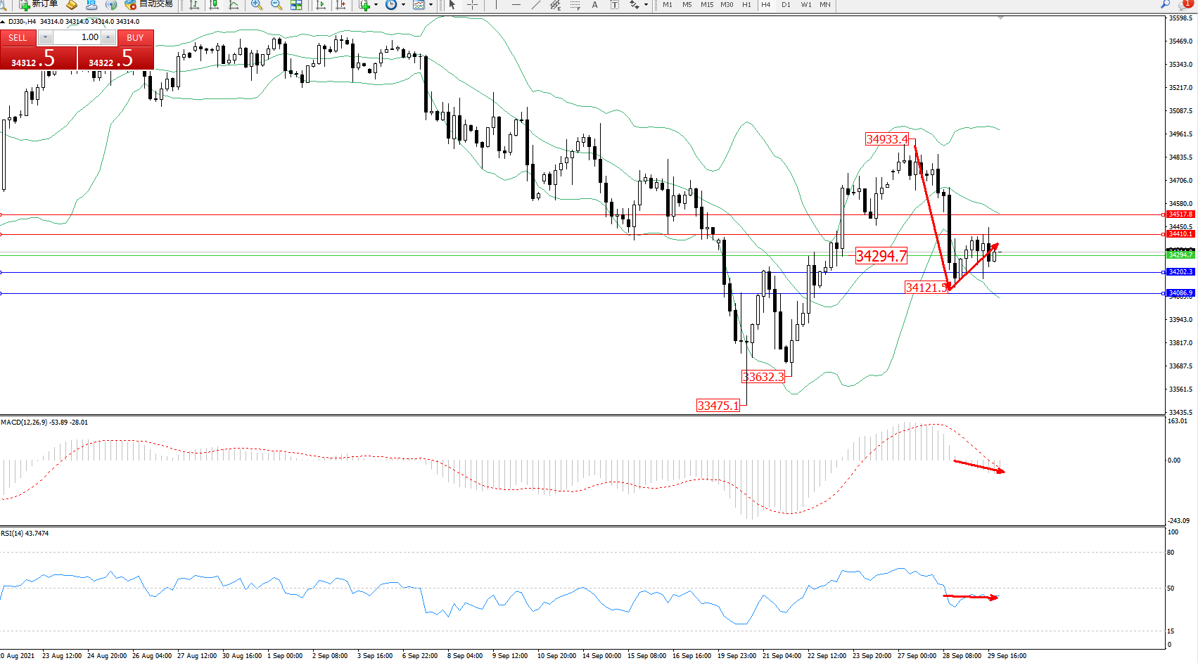 道琼斯指数DJ30——4小时K线图显示: