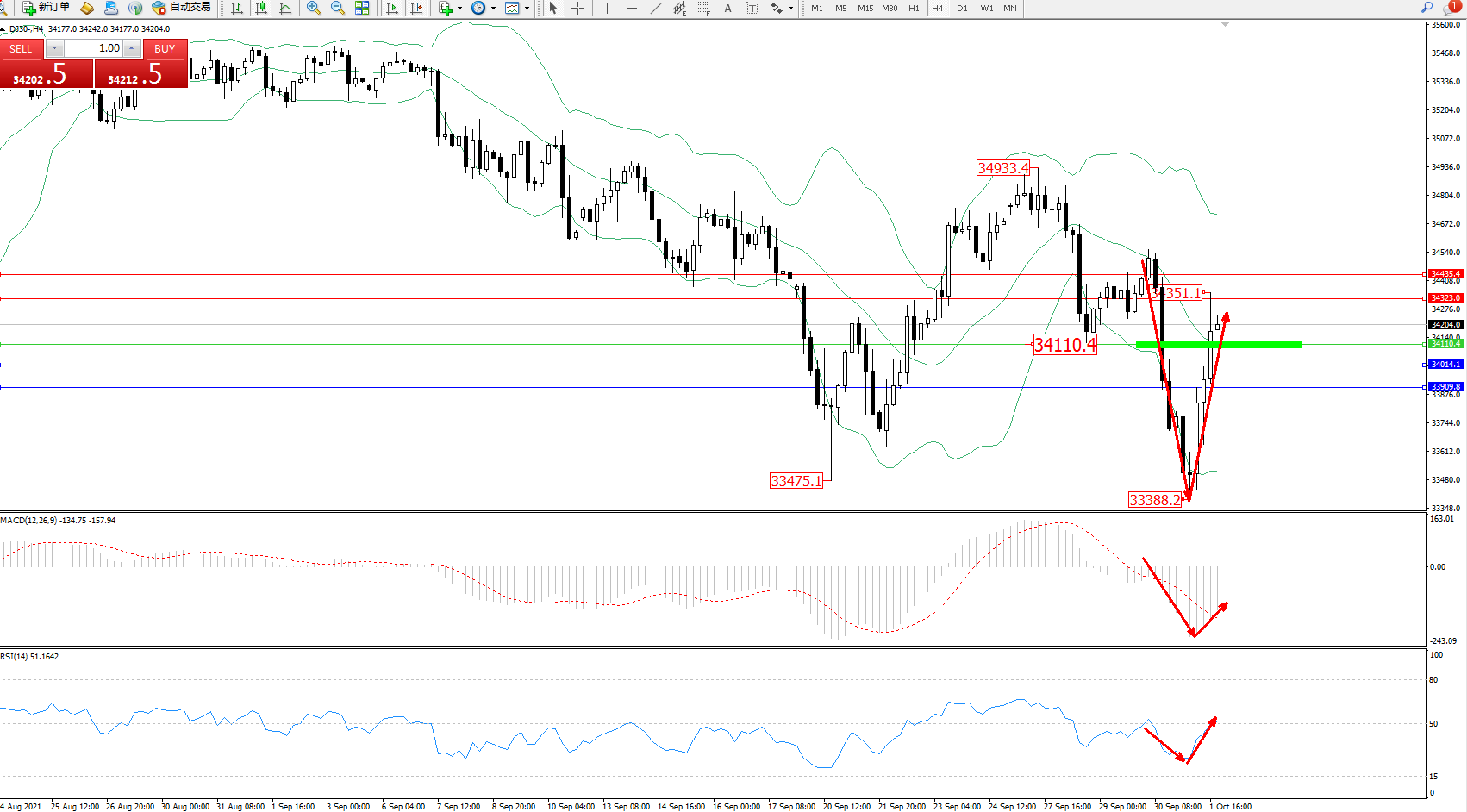 道琼斯指数DJ30——4小时K线图显示: