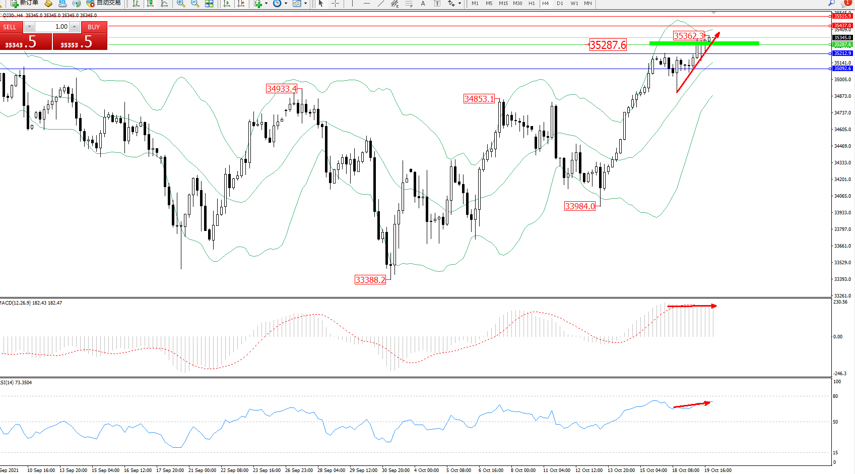 道琼斯指数DJ30——4小时K线图显示: