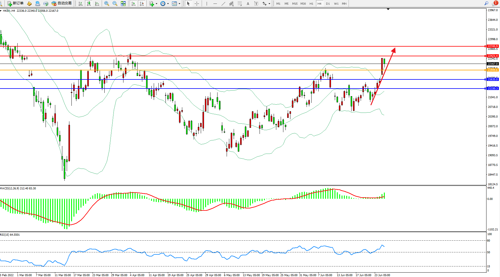 交易策略:21949上方看涨,目标22421、22745