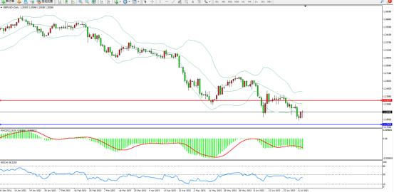 空头动力延续布林带指标通道中下轨区间持续震荡下行,低位多次触及下轨附近节点后开始整理,短期下行趋势依旧,低位弱势徘徊,布林带指标呈收口走势后开始缓慢张口,上方压制关注1.22277附近,低位支撑关注1.17970附近,MACD指标处于空头区域维持整理平移,RSI指标处于空头区域维持弱势徘徊,如图: