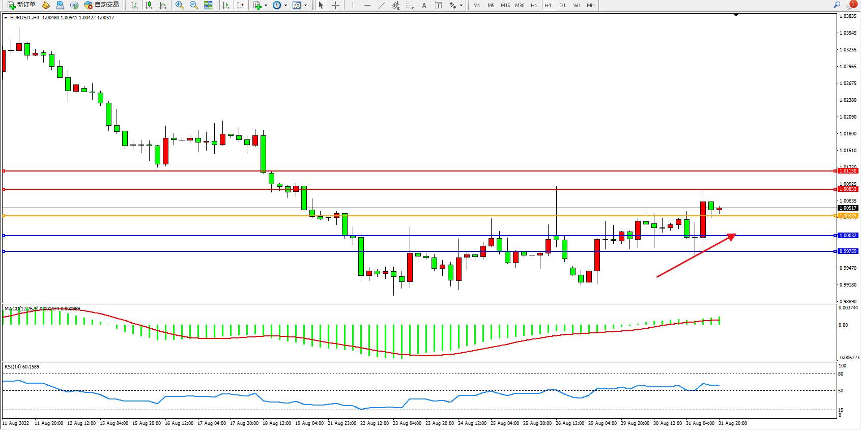 交易策略:1.00375上方看涨,目标1.00833、1.01150