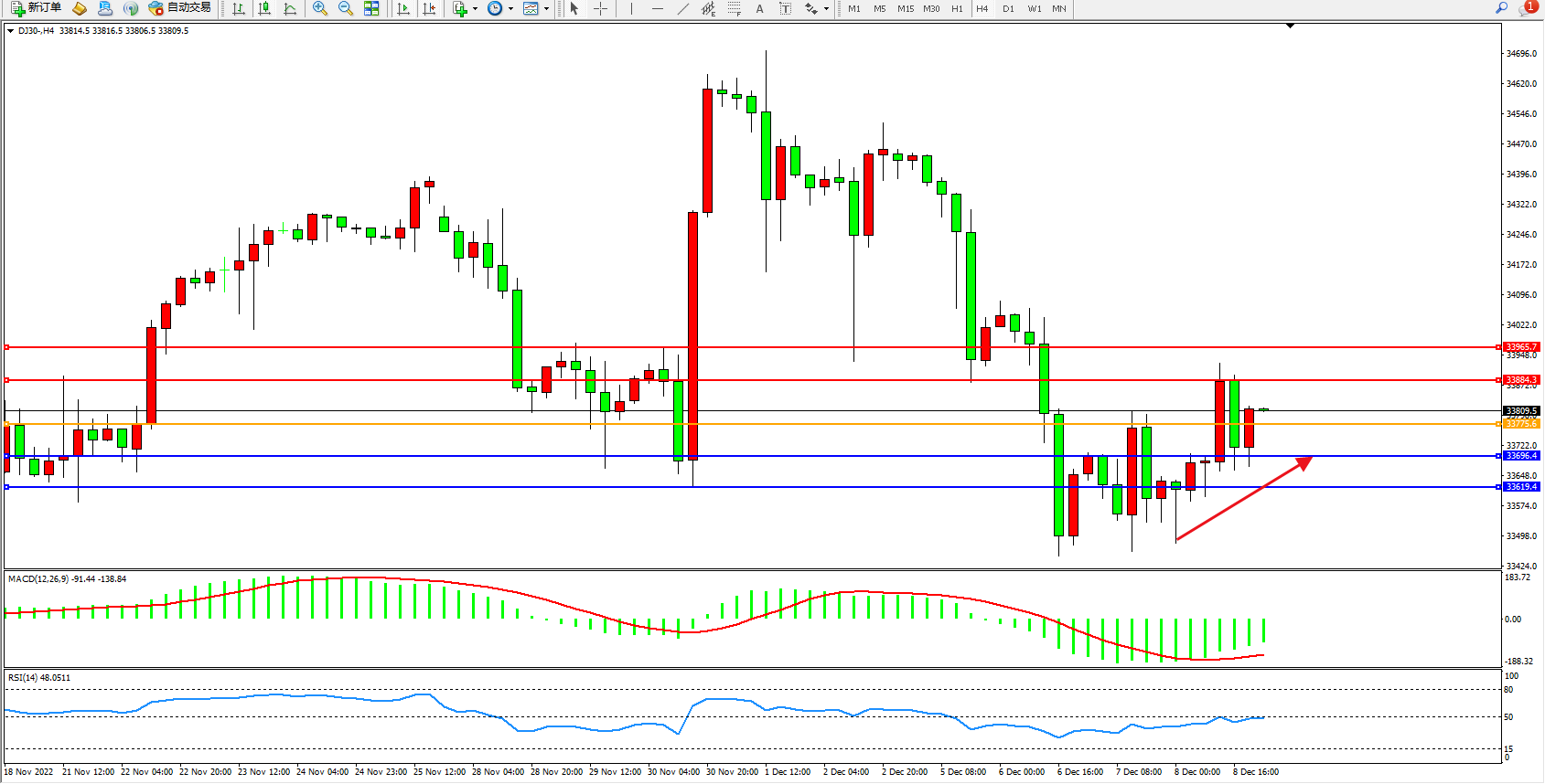 道琼斯指数DJ30——4小时K线图显示: