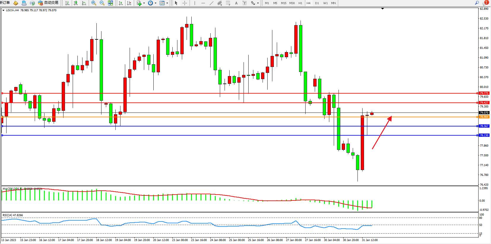原油USOil——4小时K线图显示: