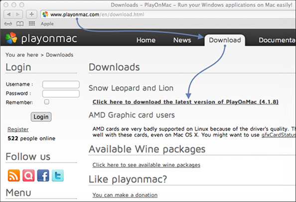 - 要安装 PlayOnMac,请打开产品的官方网站,前往download(下载),点击 链接下载最新版本。