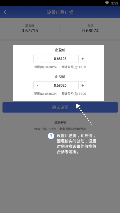 4.设置好止盈、止损价,点击[确认设置],完成设置