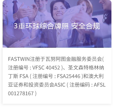 FASTWIN注册于瓦努阿图金融服务委员会(注册编号:VFSC 40452)、圣文森特格林纳丁斯FSA(注册编号:FSA25446)和澳大利亚证券和投资委员会ASIC(注册编码:AFSL 001278167)。